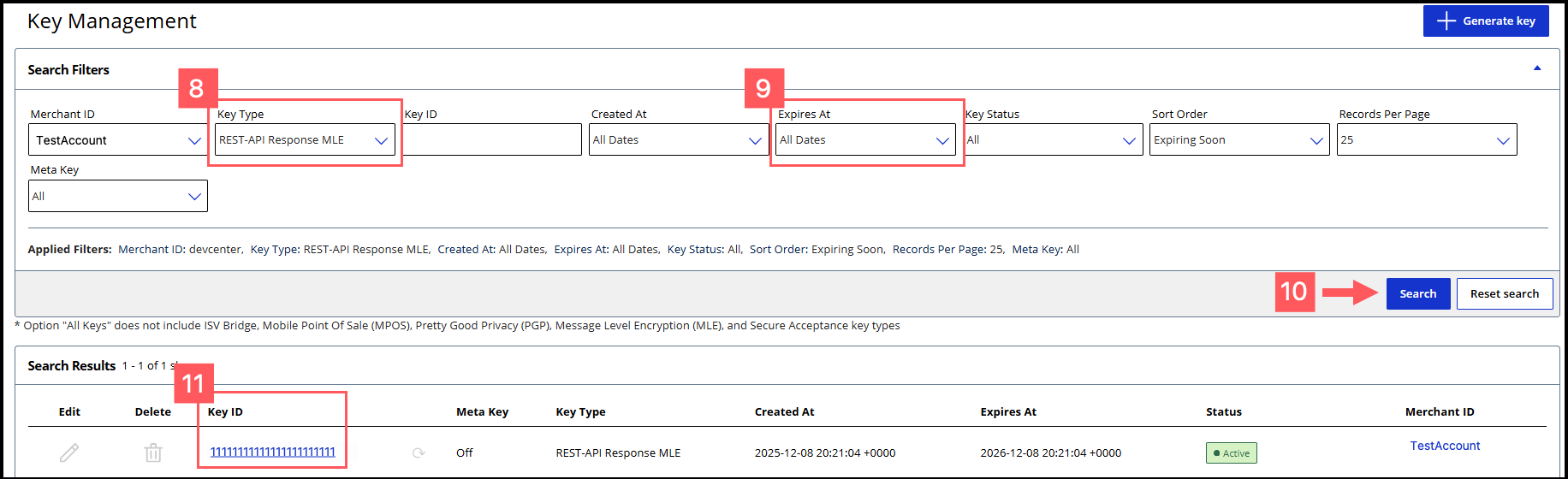 - Find the REST–API Response key that you created in the Search Results table and save its key ID.The key ID is needed to test and configure your system to use MLE.