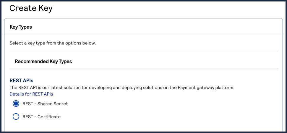 - Under REST APIs, chooseREST – Shared Secretand then clickGenerate key.
