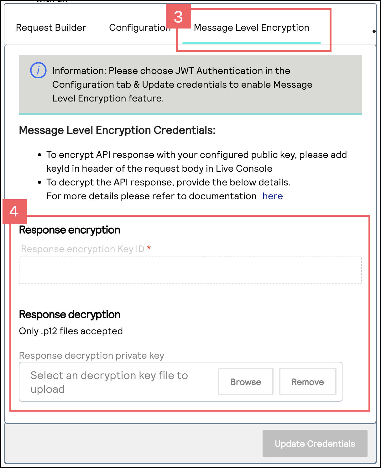 - Response encryption:Enter the key ID of your API response MLE key.This is the key ID that you saved in Step 10 in the Create or Submit an API Response MLE Key section in Enable Message-Level Encryption.